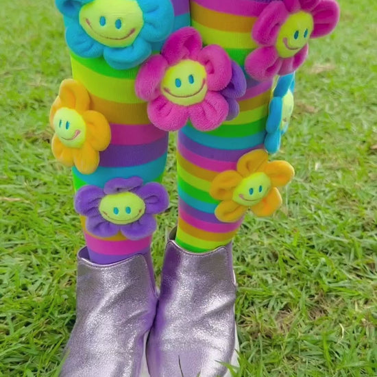 As Meias Arco-Íris com Flores trazem cor e alegria ao dia a dia das crianças. Com um design vibrante inspirado no arco-íris e flores sorridentes decorativas, estas meias transformam qualquer look num estilo divertido e cheio de personalidade.